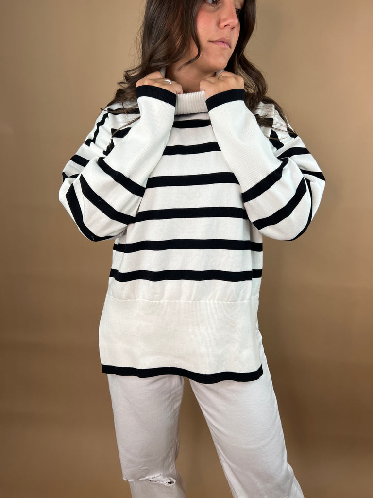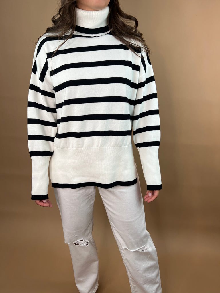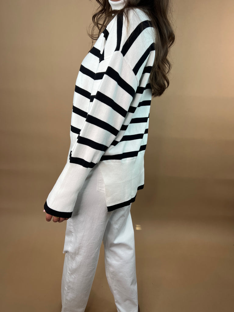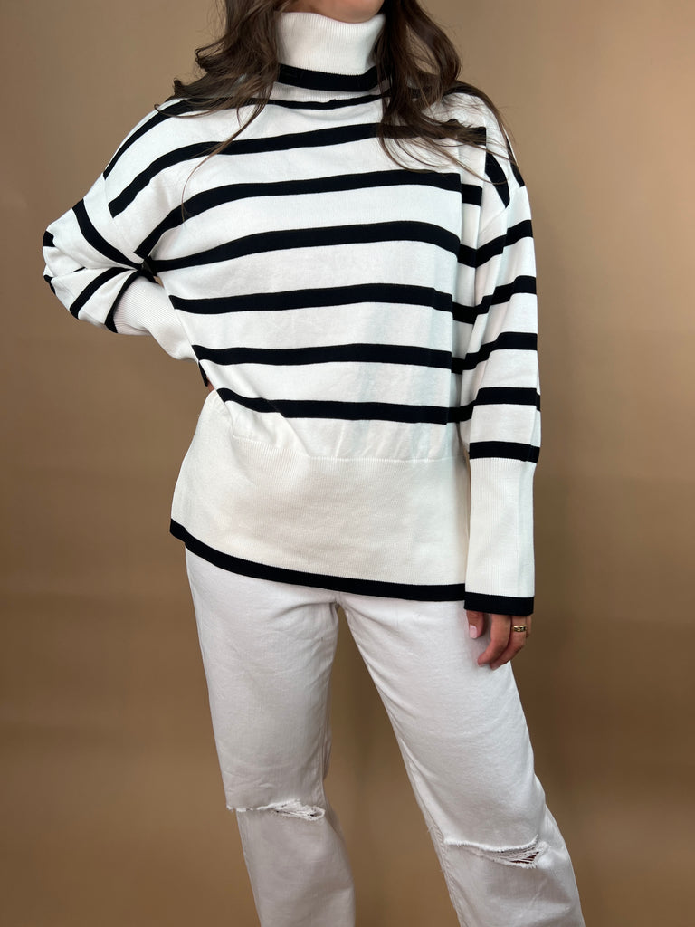 This Nalla Striped Turtleneck Knit is the perfect cozy sweater for any winter wardrobe. Crafted from a blend of soft fabrics, it features a striped contrast pattern and a warm turtleneck design.