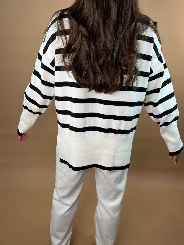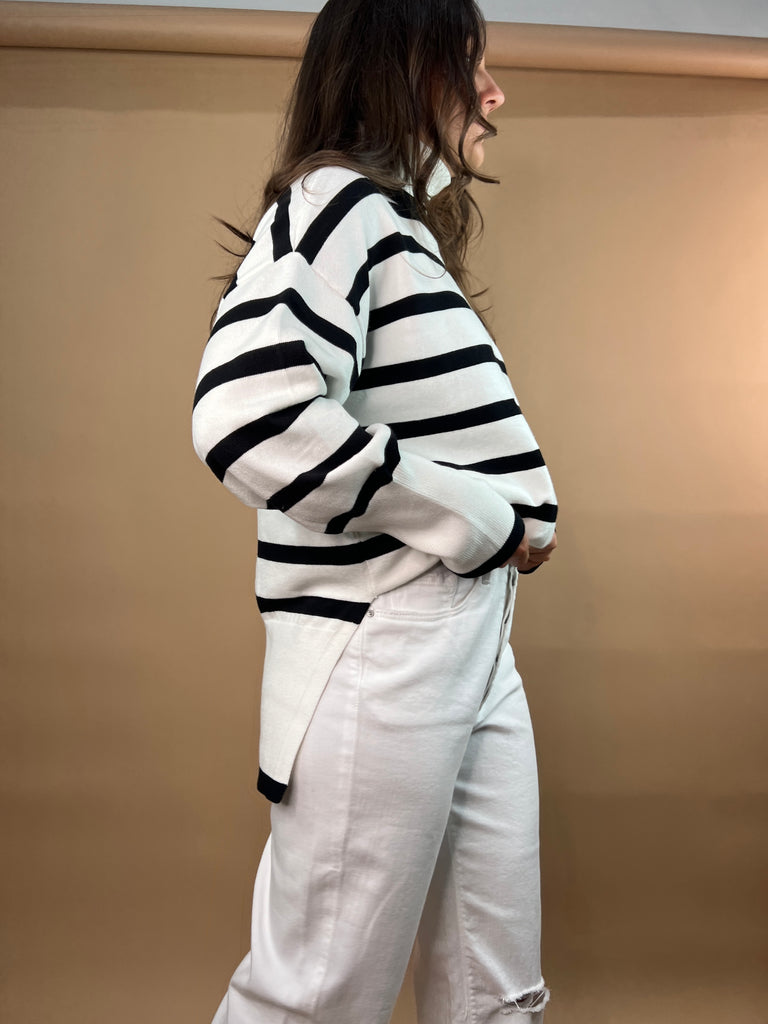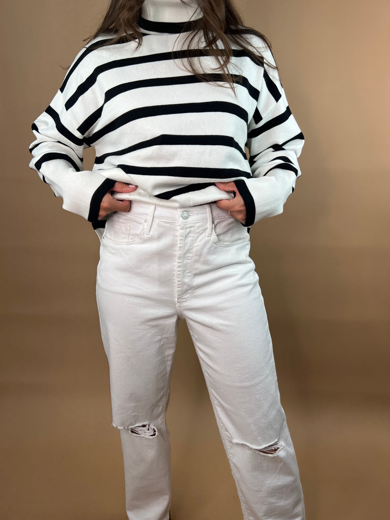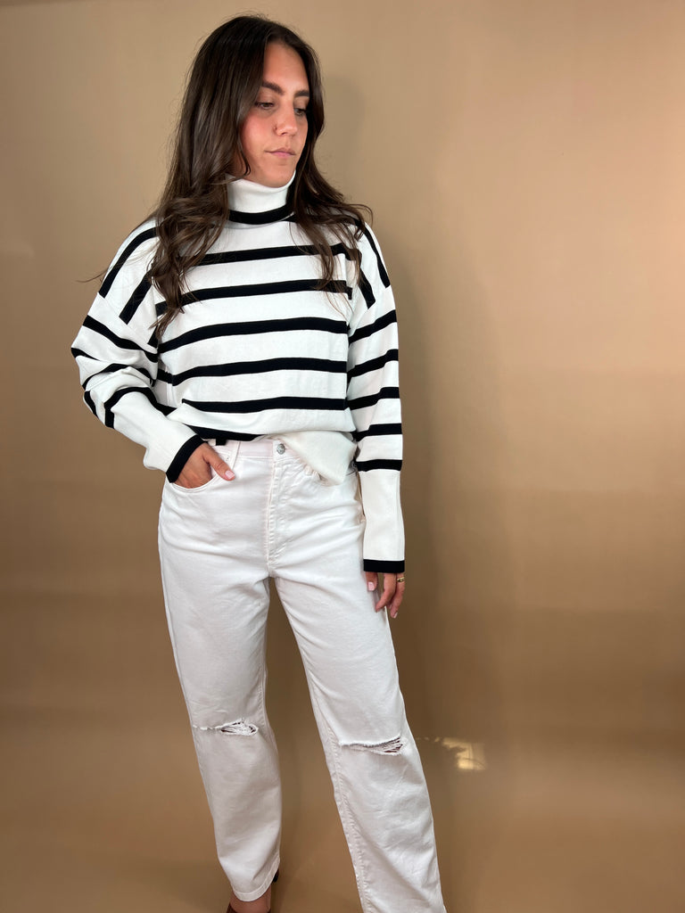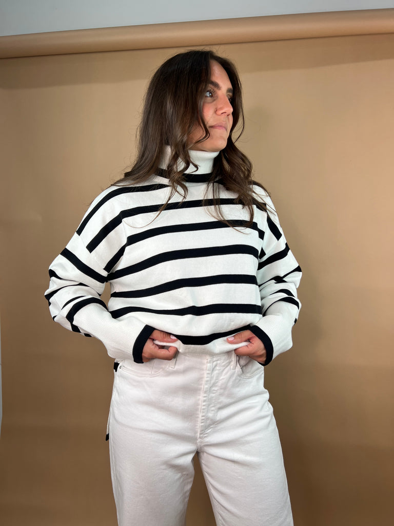 This Nalla Striped Turtleneck Knit is the perfect cozy sweater for any winter wardrobe. Crafted from a blend of soft fabrics, it features a striped contrast pattern and a warm turtleneck design.